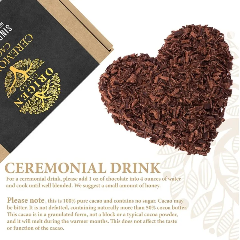 For a ceremonial drink, please add 1 oz of cacao to 4 ounces of water and cook until well blended. We suggest a small amount of honey. Use it during ceremony, meditation or your yoga practice to connect to your heart. You can also use this cacao for hot drinking chocolate, smoothies, or making your own sugar free or keto friendly chocolate.