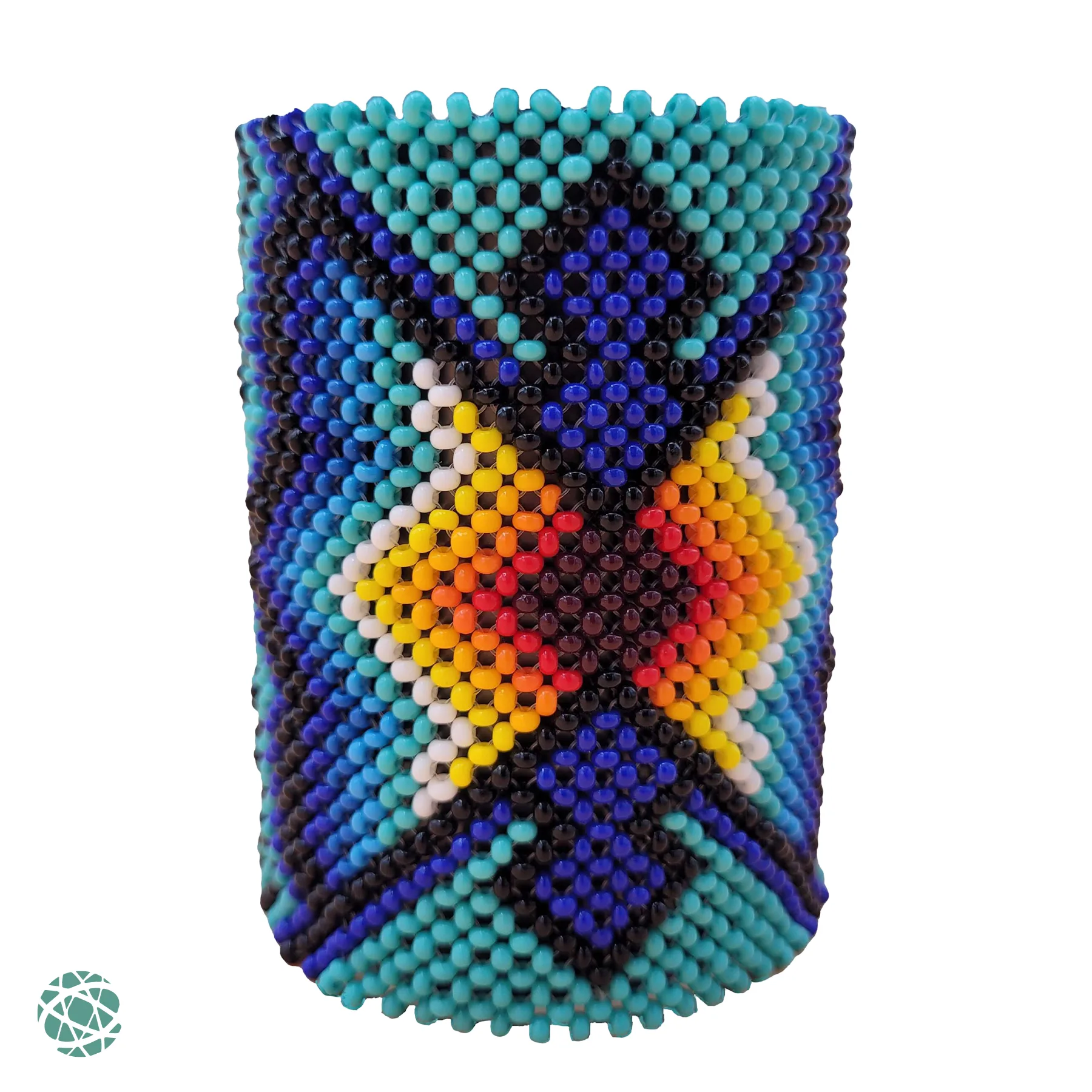 The wristband features tribal designs or “Kenê” as they call the images they use for body painting. They represent sacred animals like the Boa Constrictor and the Butterfly.