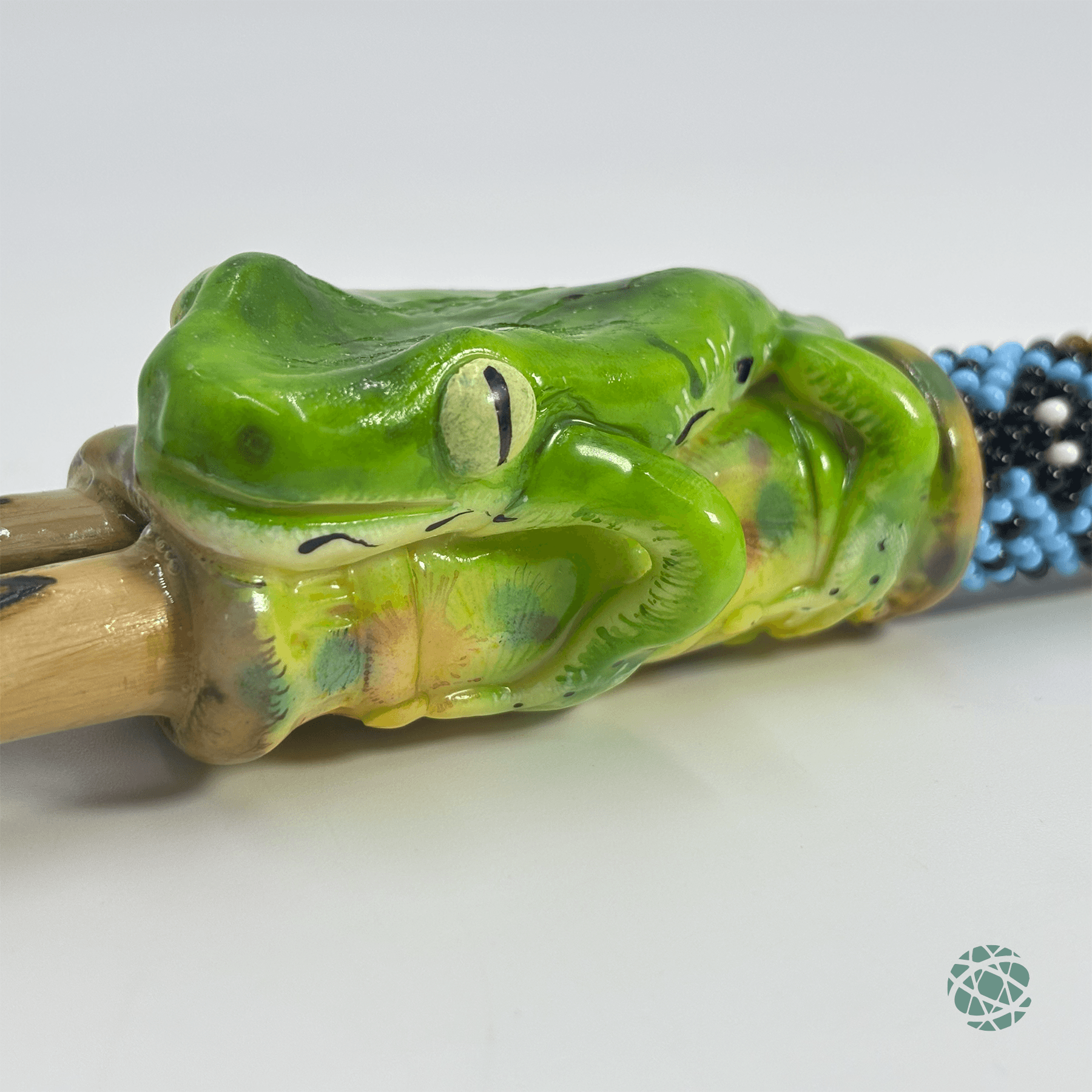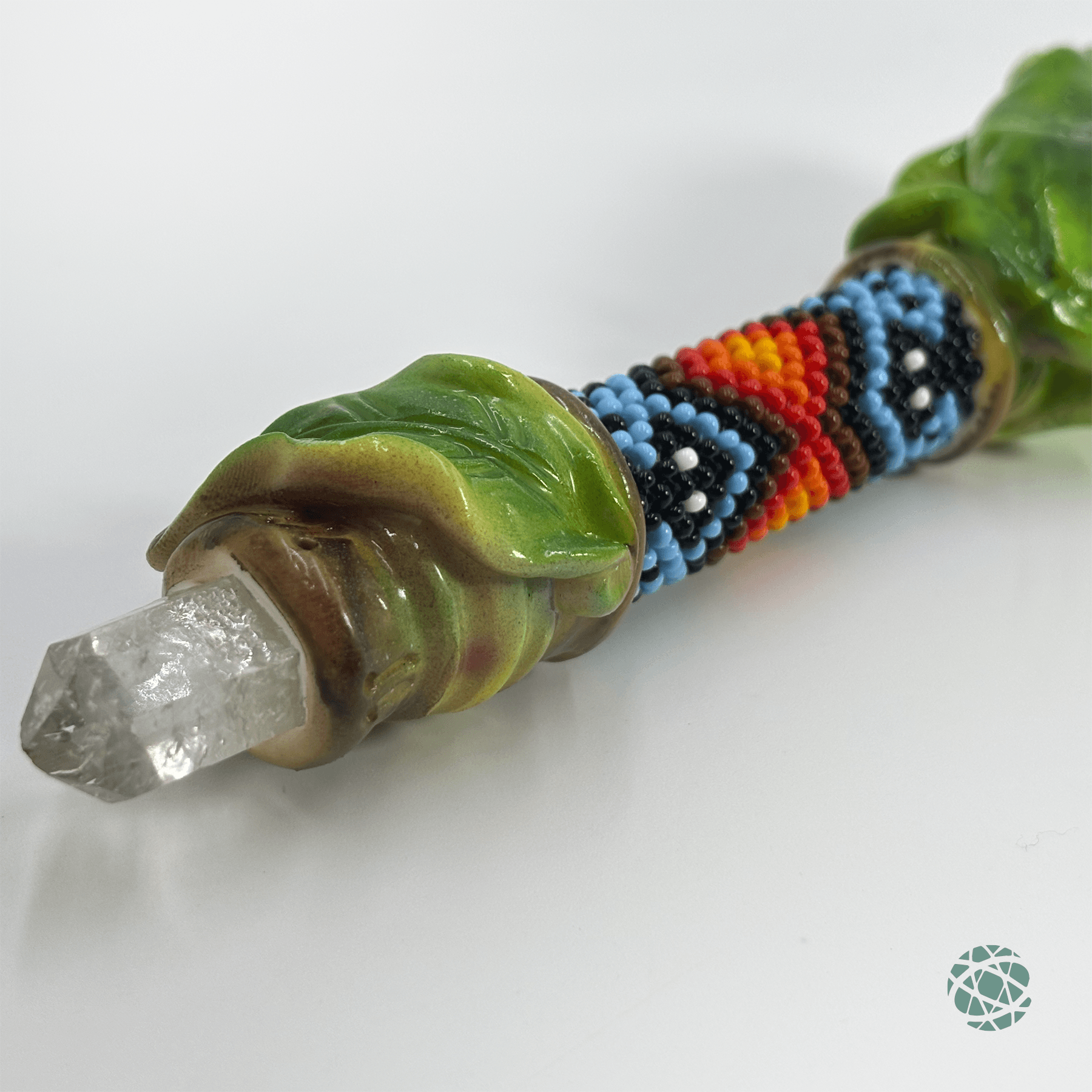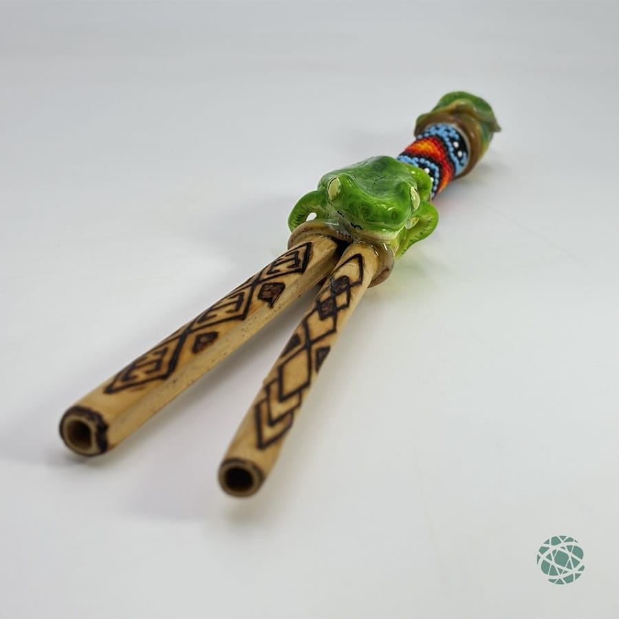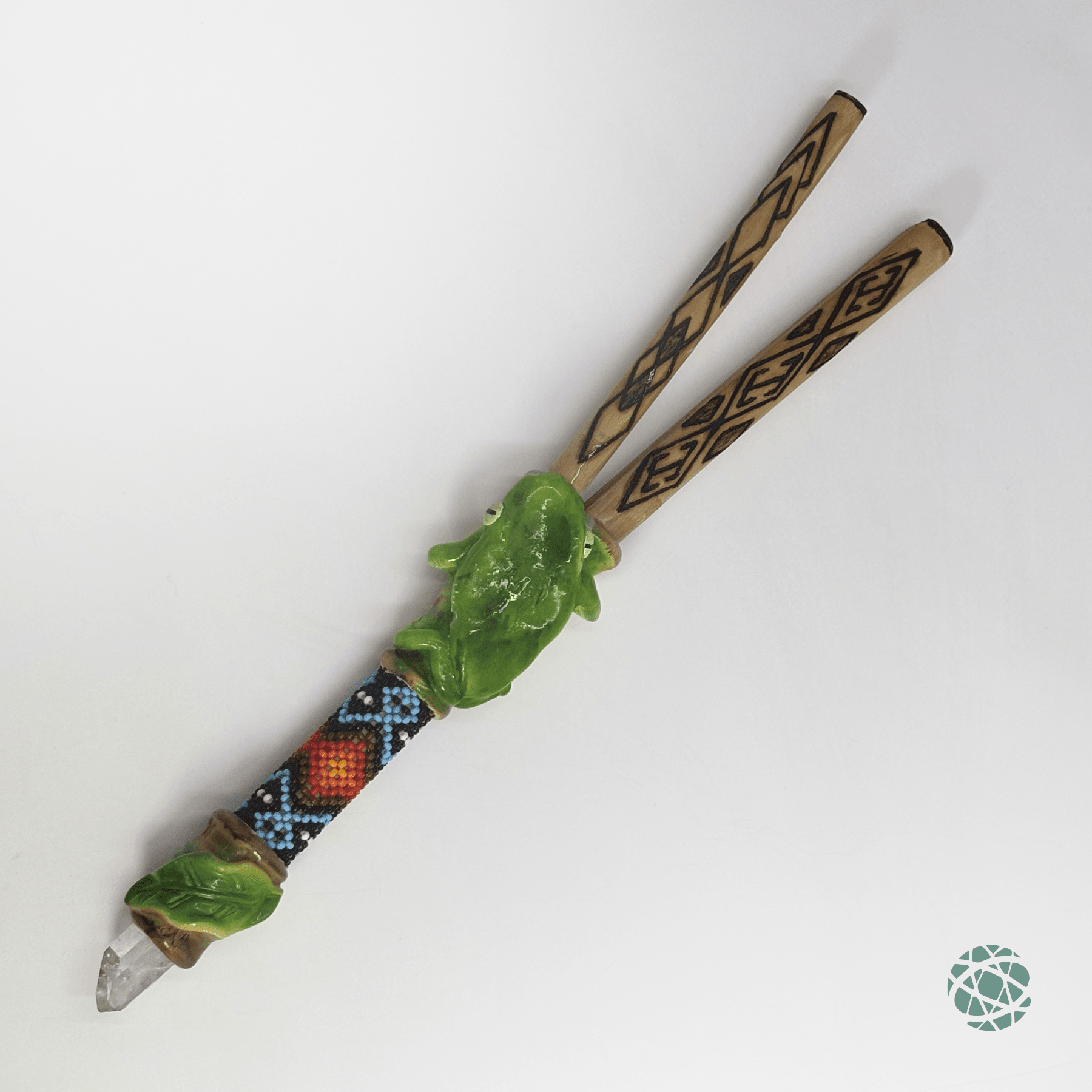 At the center of this piece, you’ll find a hand-carved frog (Kambo) element, symbolizing cleansing, transformation, and a deep connection to the Amazonian traditions where these tools originate.